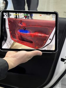 タブレットのビデオ機能でドアのパネルを映すと・・・映っているドアパネルを固定しているクリップやボルトの位置、骨組み等が可視化されてタブレット上で確認できるようになっている。これでだれでも簡単に取り外しが可能となった。